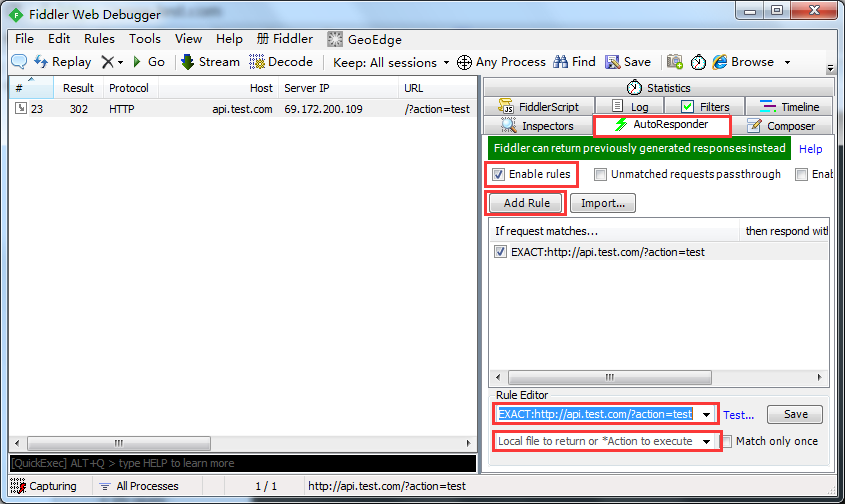 选中拦截到的接口请求,在功能区切换到 AutoResponder,勾选 Enable rules,点击 Add Rule,在下方的 Rule Editor 区域配置拦截规则和返回规则。